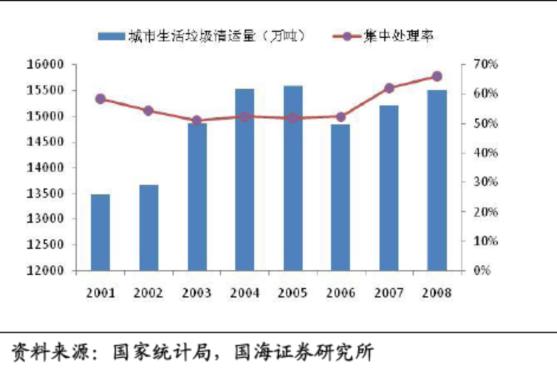 固體廢物可以分為工業(yè)固廢、生活垃圾及危險(xiǎn)廢物,而后者的數(shù)量比重很小。2001年至2009年間,工業(yè)固廢的產(chǎn)生量從約9億噸激增到約21億噸,年均復(fù)合增長(zhǎng)率達(dá)到12%。由于生活垃圾的產(chǎn)生量比較難統(tǒng)計(jì),在統(tǒng)計(jì)局給出的數(shù)據(jù)中一般用垃圾清運(yùn)量指標(biāo)來(lái)代替。生活垃圾的實(shí)際產(chǎn)生量約為清運(yùn)量的兩倍,且清運(yùn)比逐年上升趨勢(shì)。2001-2008年,城市垃圾產(chǎn)量復(fù)合增長(zhǎng)率為5%,而垃圾清運(yùn)量的增速僅為2.03%,整體來(lái)看,垃圾清運(yùn)的速度不及垃圾產(chǎn)生的速度,垃圾圍城現(xiàn)象出現(xiàn),垃圾處理問(wèn)題開始引起民眾和政府的高度重視。截止2007年,我國(guó)未經(jīng)處理的城市生活垃圾累計(jì)堆存量已達(dá)70多億噸,侵占土地面積超過(guò)5億多平方米,全國(guó)660個(gè)城市中有約200個(gè)城市陷入垃圾包圍之中。深圳市創(chuàng)新投資集團(tuán)有限公司發(fā)展